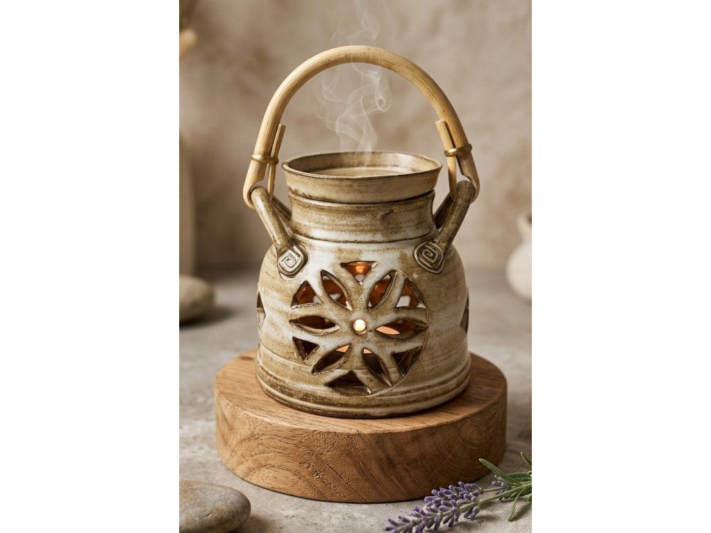 Proměňte svůj domov v oázu klidu. Tato unikátní keramická aromalampa kombinuje syrovou krásu pálené hlíny s hřejivým detailem přírodního bambusu. Její jemné výřezy ve tvaru květu nejsou jen na ozdobu – při zapálení čajové svíčky rozehrají v místnosti uklidňující hru světel a stínů.