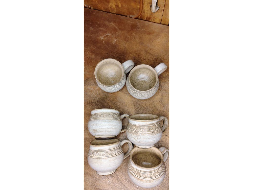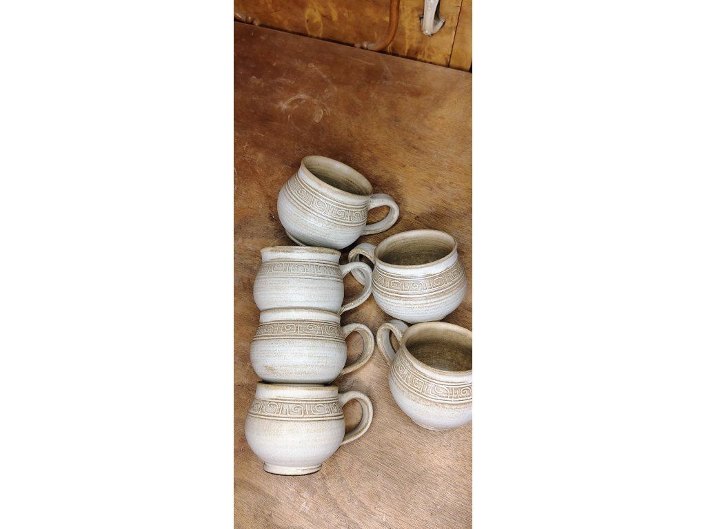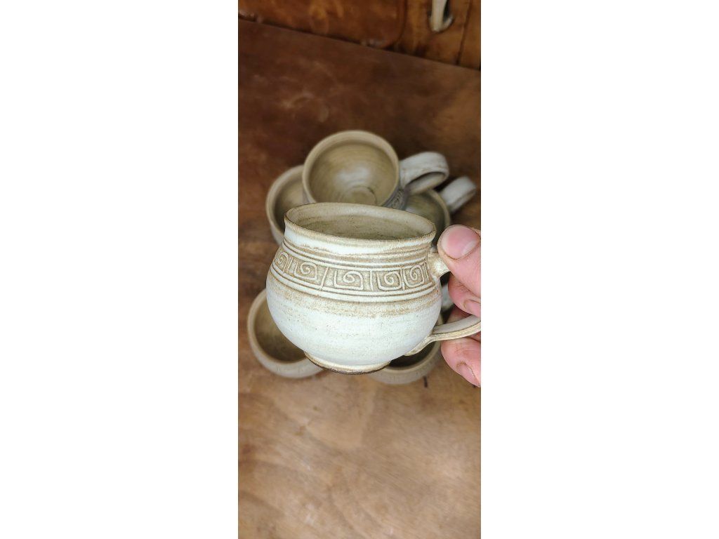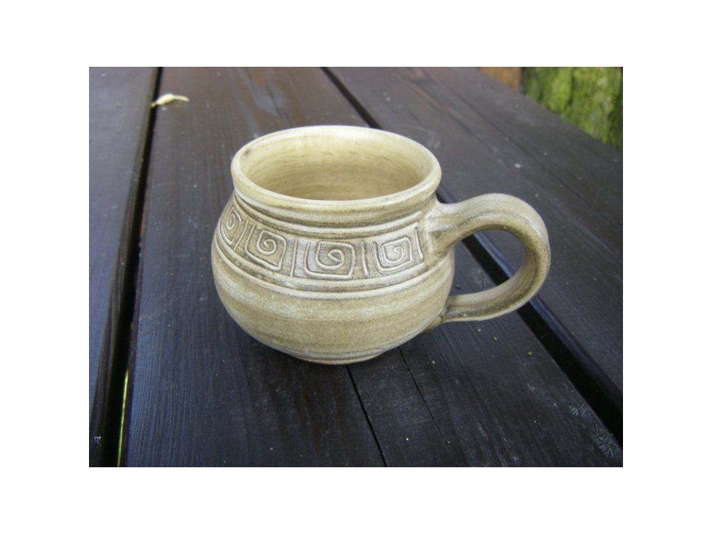 Bucláček s uchem, zdobený rytým dekorem. Svým objemem je vhodný na standardní porci kávy (lungo, cappuccino) nebo bylinkový čaj. Písková glazura s tmavším zvýrazněním detailů dodává hrnku starobylý, nadčasový vzhled.
