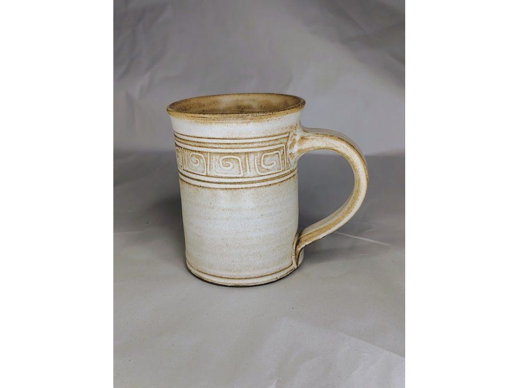 Klasický rovný hrnek vyrobený z vysokopálené keramiky. Světlá glazura s přírodní patinou zvýrazňuje detaily ruční práce. Díky rovnému tvaru je hrnek velmi skladný a stabilní.